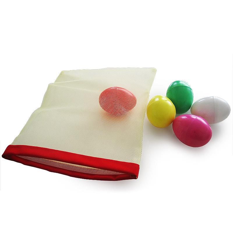 Five different colored eggs are put in a clear net bag. The performer explains that inside one egg is a gold ring or a bill. Four spectators freely pick an egg each, the last egg is left to the performer. Each spectator opens his egg to reveal nothing. When the performer’s egg is opened it has the gold ring or the bill.