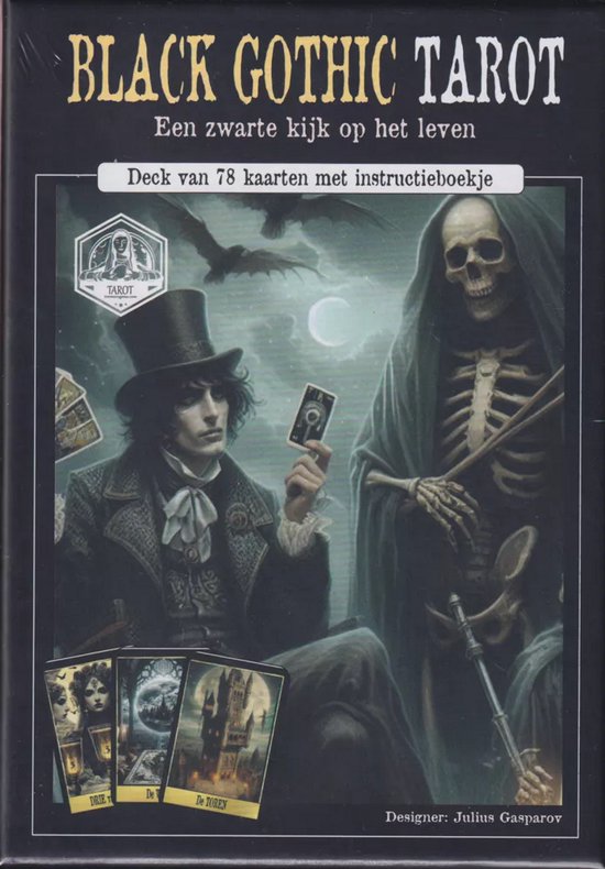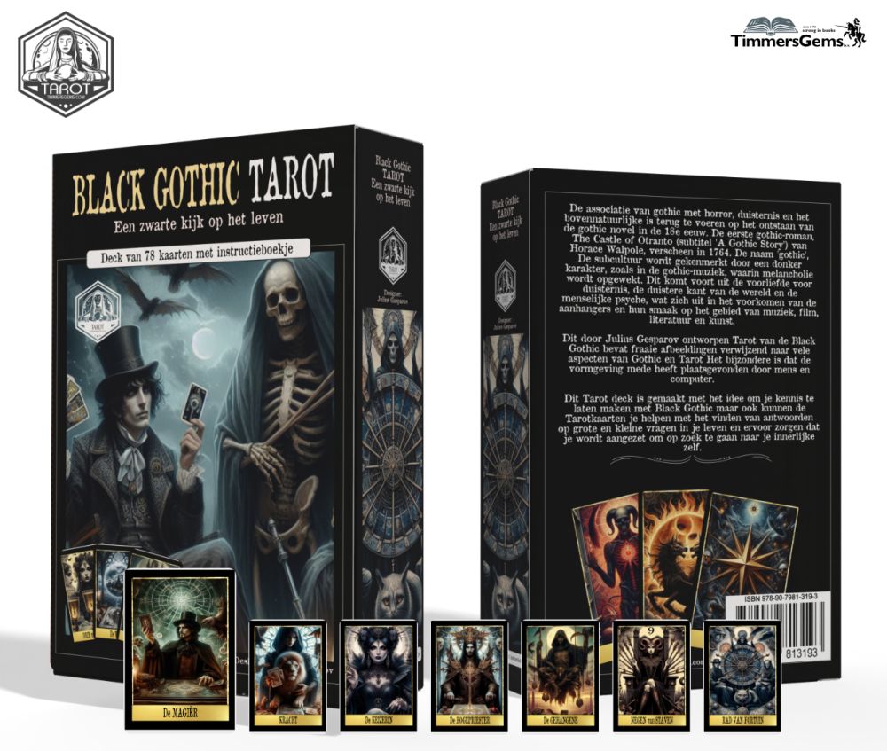 Dit door Julius Gesparov ontworpen Tarot van de Black Gothic bevat fraaie afbeeldingen verwijzend naar vele aspecten van Gothic en Tarot Het bijzondere is dat de vormgeving mede heeft plaatsgevonden door mens en computer. Dit Tarot deck is gemaakt met het idee om je kennis te laten maken met Black Gothic maar ook kunnen de Tarotkaarten je helpen met het vinden van antwoorden op grote en kleine vragen in je leven en ervoor zorgen dat je wordt aangezet om op zoek te gaan naar je innerlijke zelf.