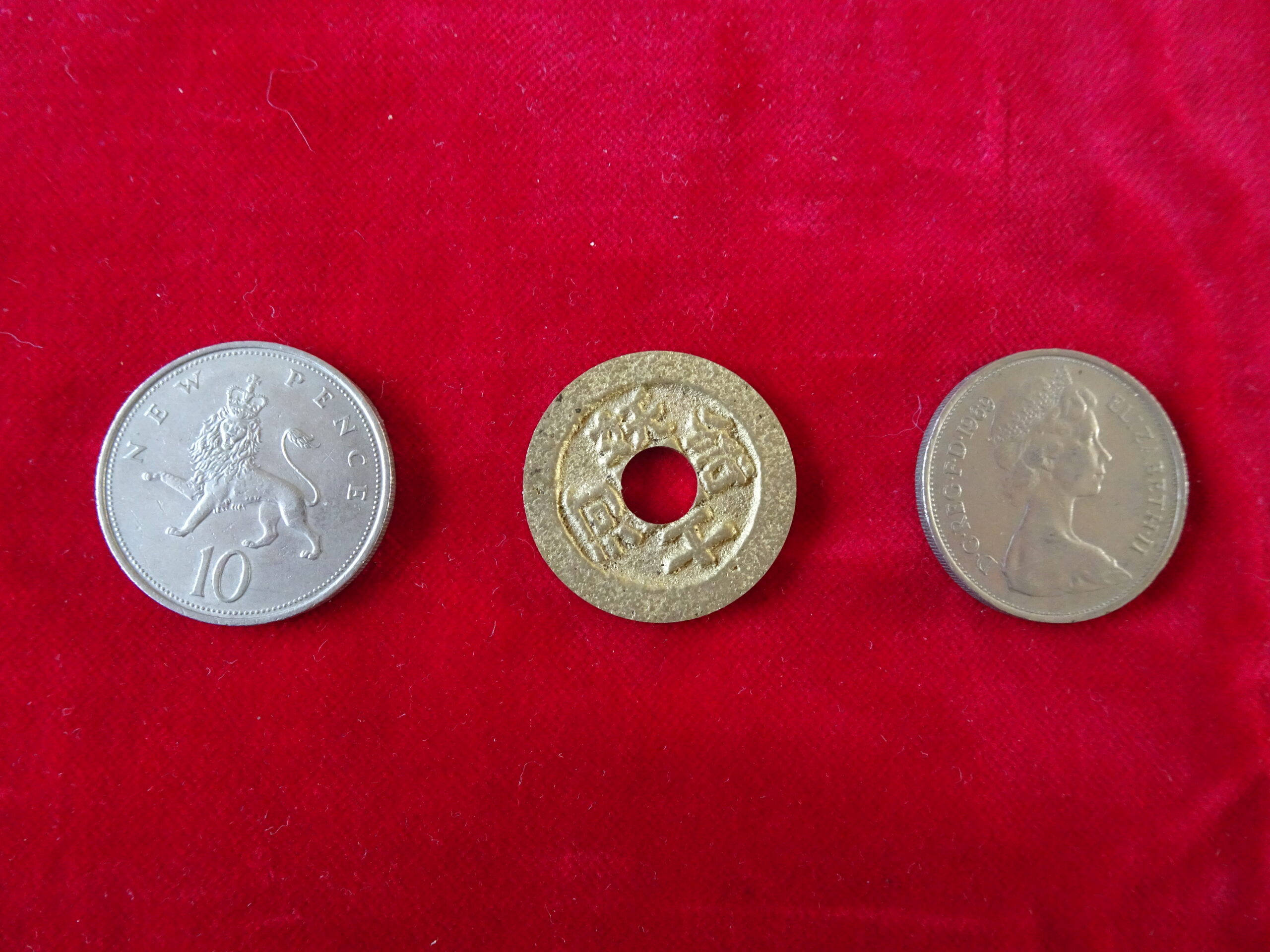 Een Engelse 10 penny coin verandert in een chinese munt, die je gelijk kan laten vallen