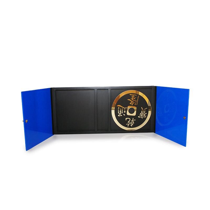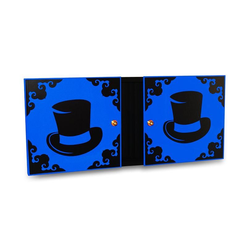 A wooden double compartment box with two lids is shown. The doors are opened to show the box is empty. Then a small size Chinese coin is introduced and placed into the left compartment of the box and the doors are closed. The box is then tilted, and the door to that compartment is opened. The Chinese coin is seen to have vanished. The audience is not impressed, because they have seen the Chinese coin slide to the opposite compartment through the open space between the two doors. They ask the magician to open the door to the other compartment. The magician closes the door to the first compartment then tilts the box, (the audience again sees the Chinese coin sliding over), then opens the door to the adjacent compartment to show that it is empty. This business of sliding Chinese coins from one compartment to the other is repeated, till the audience is howling for both doors to be opened at a time.
