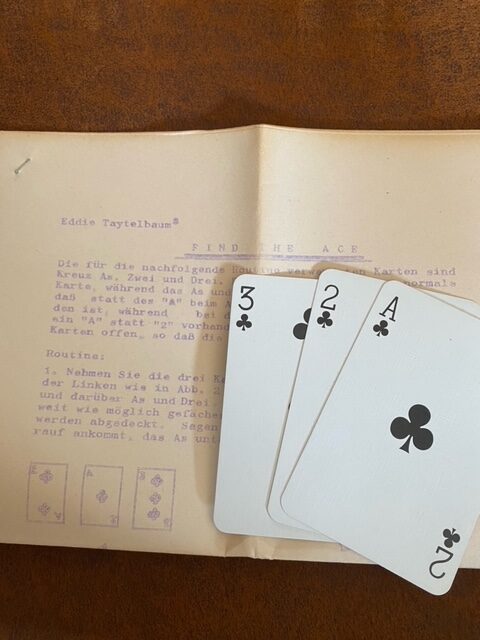Eddie Taytelbaums Version des Monte-Effekts mit englischen Waddington-Karten (Kreuz As, Kreuz Zwei, Kreuz Drei). Das Besondere (und der Sammler-Aspekt) an dieser Ausführung liegt in der Tatsache, dass die Karten von Taytelbaum selbst von Hand “getricks” worden sind!