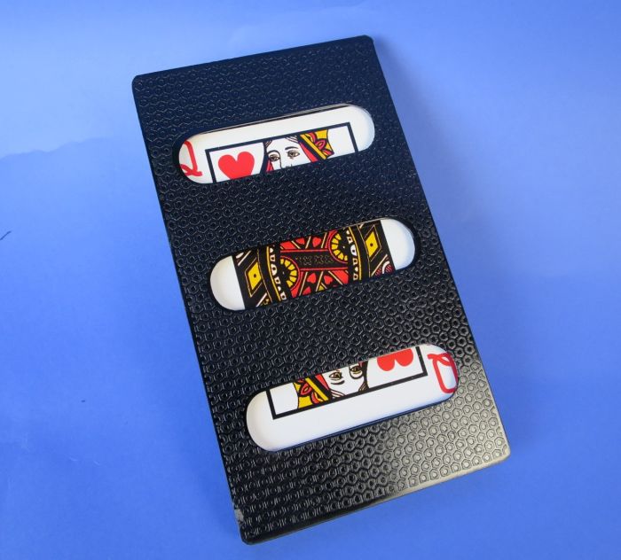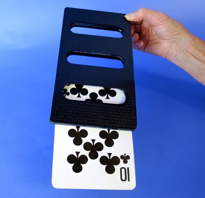 Je doet een voorspelling in de vorm van een gigantische kaart, die je van achteren laat zien en in een rasterkader plaatst. Laat de toeschouwer vervolgens een kaart trekken om naar te kijken, zoals ruiten 10. Als je het frame omdraait, bevat het echter niet de 10 van diamanten, maar een hartenkoningin. Er is leedvermaak – maar niet voor lang. Je pakt het frame met de zichtbare kaart erin en schuift deze op tafel. Terwijl ze naar buiten glipt, verandert de Hartenkoningin zichtbaar in de 10 van Diamanten! Ja, je kunt de transformatie bekijken, want de kaart transformeert zichtbaar! Het frame doet het werk voor je, de kaart transformeert automatisch. Makkelijk te demonstreren. Het frame is gemaakt van kunststof en zeer robuust!