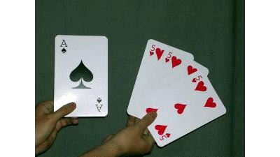 Jumbo Quick Switch: Three similar Cards, (say 5H) and an odd “wild” card, (say an AS) are shown. Instantly, they change to three AS and one 5H. Finally, the last 5H turns to a AS, as well.