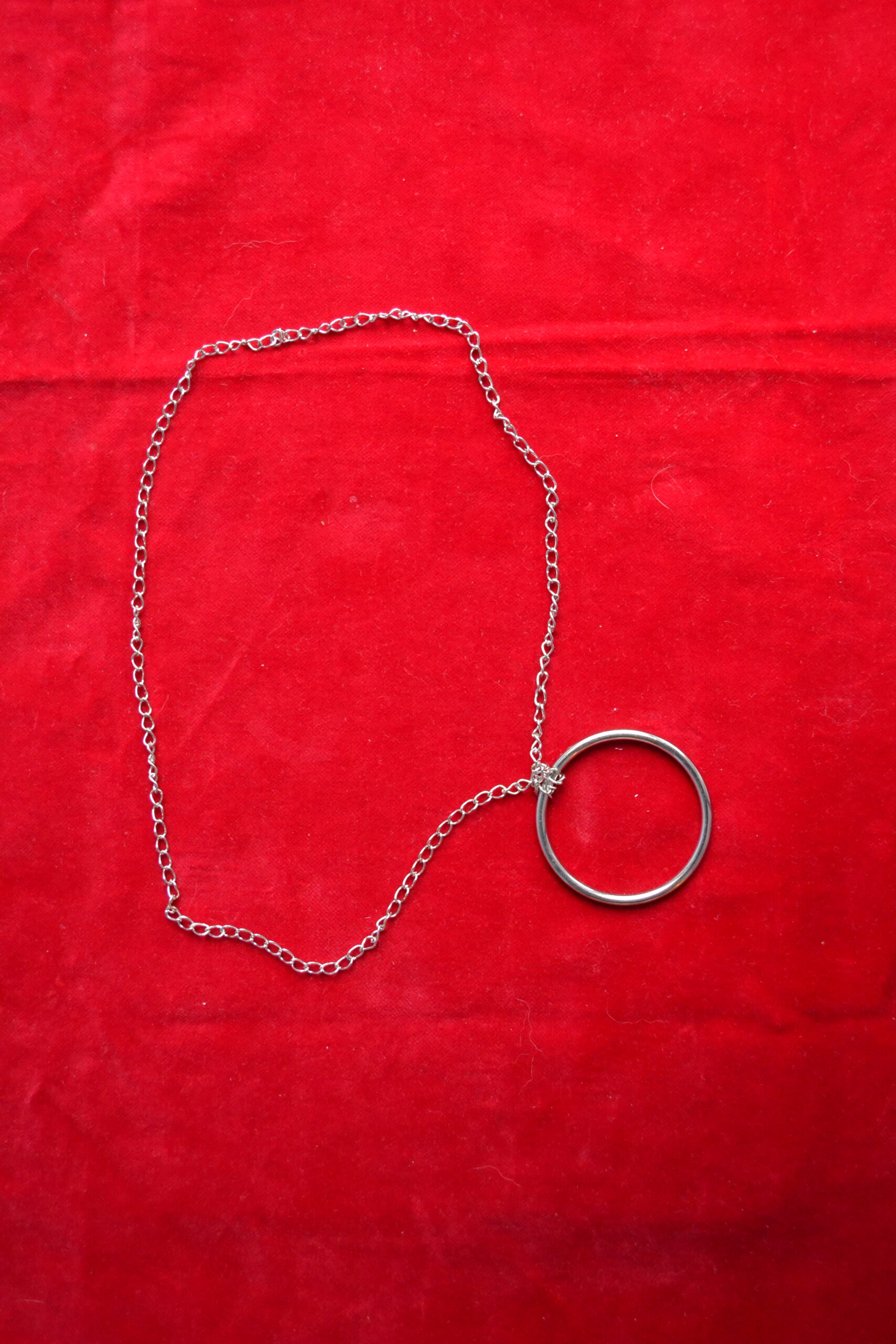 Als je de ring laat vallen blijft hij hangen aan de ketting (toeschouwer lukt dat niet)