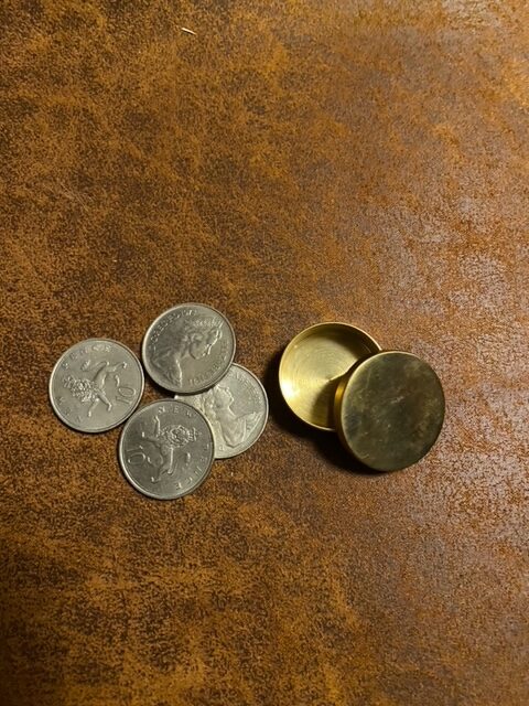 Mooie messing Okito box met 4 Engelse munten (zonder beschrijving)