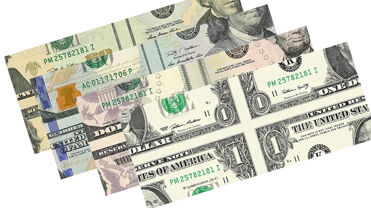 DJT offers $1, $5, $20 & $100 bills.