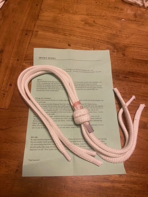De goochelaar laat door twee toeschouwers ieder een touw van drie kiezen met een biljet in een van het touw. Het overgebleven touw is voor de goochelaar en wat blijkt het touw wat overblijft heeft het geldbiljet erin geknoopt !!!!