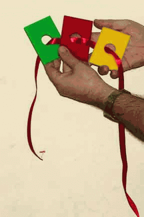 Magician shows three different colored Panels, with a hole in them, and a length of Ribbon. A spectator selects any color, which is placed between the other two, and the Ribbon threaded through the center of the Panels. Magician spreads the Panels to show Ribbon passes through them, puts them together, and places a Rubber band around the Panels. The Ribbon is pulled to and fro to show it passes through the Panels.