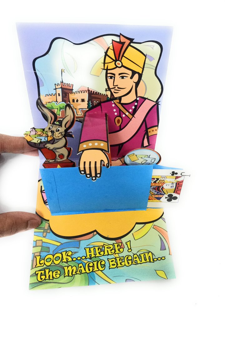 A closed envelope is shown. A freely selected card is signed by the spectator and is returned to the deck. The envelope is opened to show a beautifully illustrated 3D greeting card. An envelope pops up in the greeting card. This is handed over to the Spectator and he is asked to remove the contents of the envelope. When he does so, he finds his own signed card!