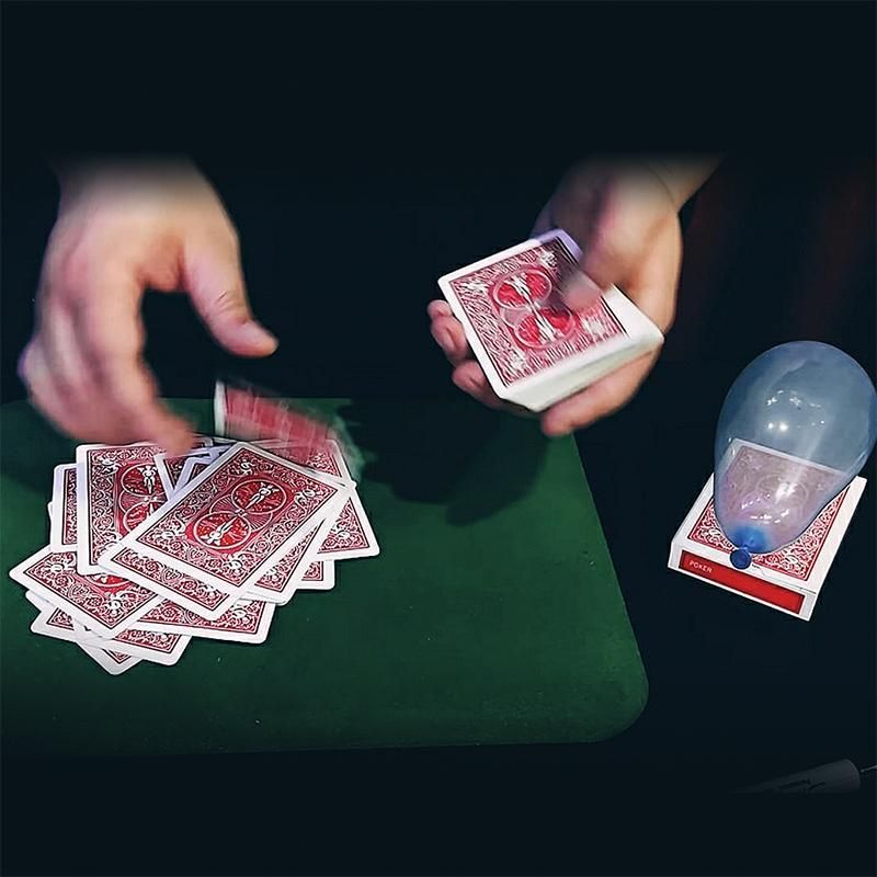 A chosen card is returned to the deck. The magician inflates a balloon and places it on the case.
