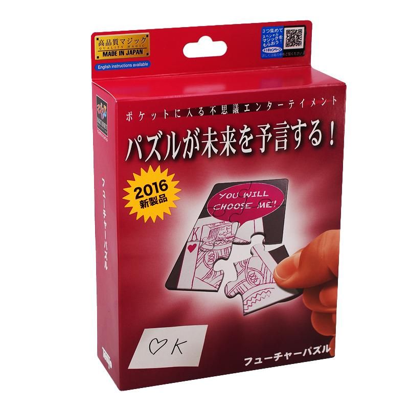 The magician shows a case containing loose pieces from a jigsaw puzzle, and places the case on the table. A spectator is asked to freely name any picture card in a deck of playing cards. When the puzzle pieces are removed from the case, and assembled on the table, the selected picture card is displayed on the pieces of the puzzle! This unique prediction effect is a brand new addition to the world of magic. It appears to be a very simple procedure – as soon as the spectator names a card, you merely open the box and dump out the puzzle pieces. There is no apparent room for trickery. You will be surprising audiences in no time.