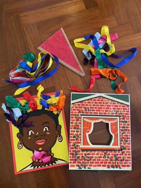 Goochelaar toon een meisje dat graag linten in het haar wil hebben, het meisje gaat naar huis (en kijkt door het raam), de goochelaar heeft losse linten en stopt die in een switch cone maar de linten zijn nu verandert in een lange lint. na opnieuw het te proberen zijn de linten weg en Heidi komt uit het huis met linten in het haar. (tweede hands en 30 x 40 cm groot)